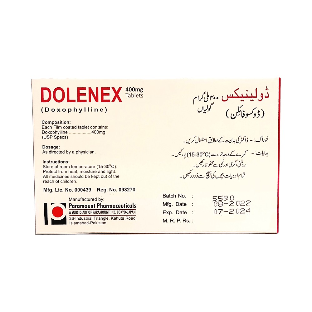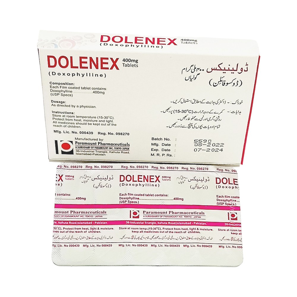 | Doxophyline | Dolenex | 400mg | 10’s | Tablet |