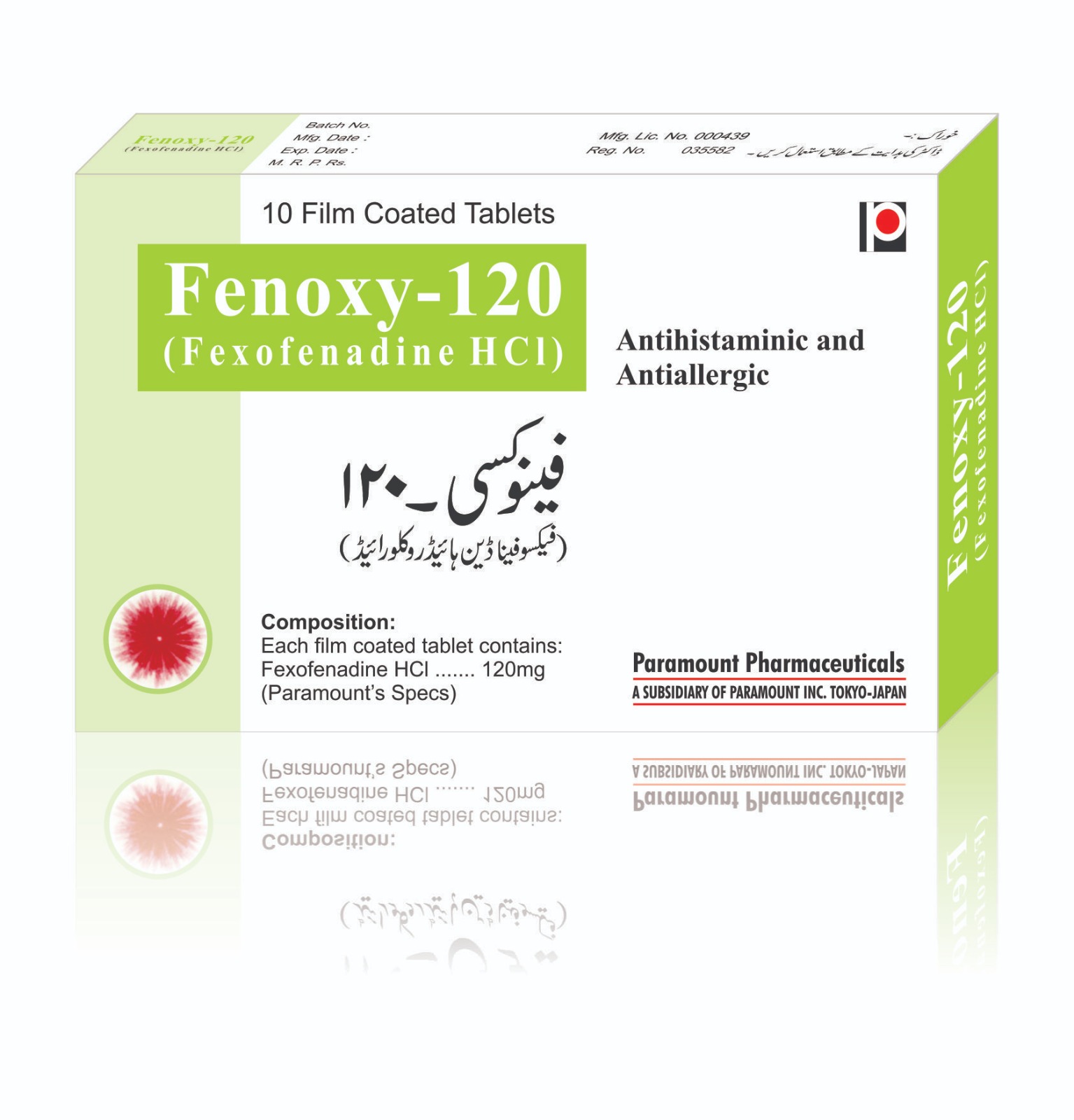 | Fexofenadine as HCl | Fenoxy-120mg | 120 mg | 10’s | Tablet |