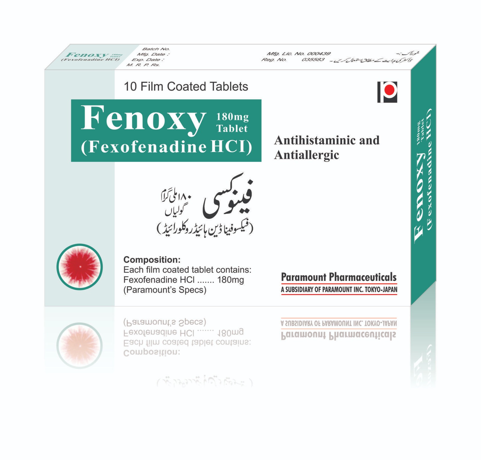 | Fexofenadine as HCl | Fenoxy-180mg | 180 mg | 10’s | Tablet |