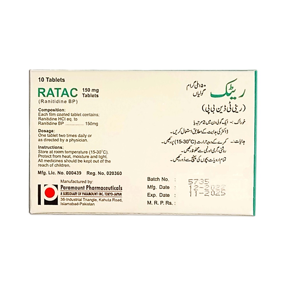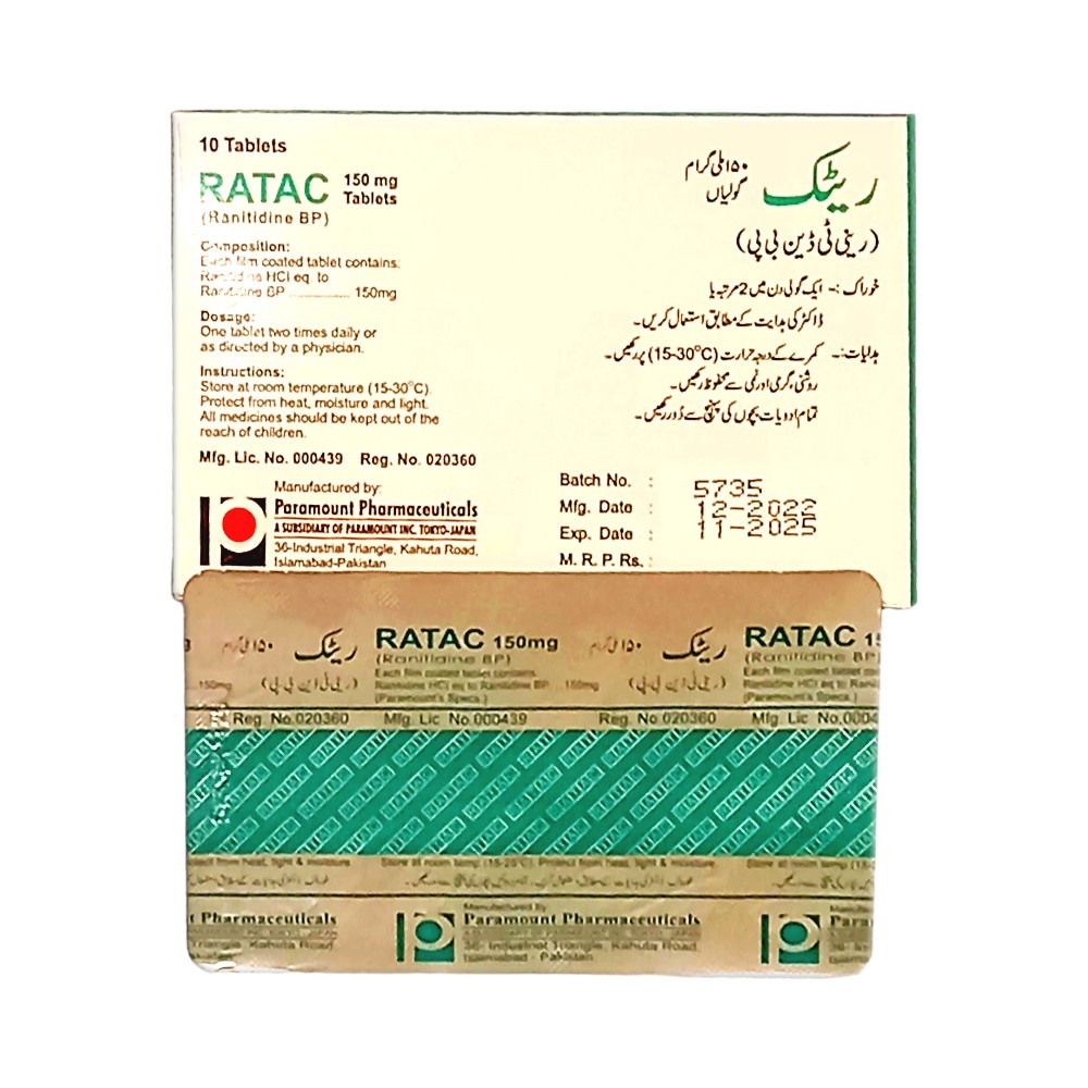| Ranitidine | Ratac | 150mg | 10’s | Tablet |